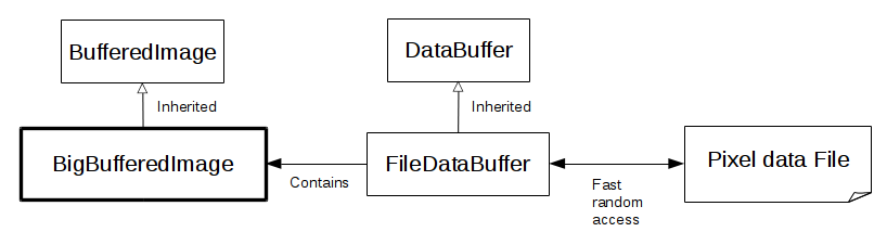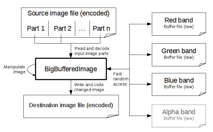 For each image band (Red, Green, Blue, Alpha) there is a buffer file on the storage. The buffer files are accessed with a MappedByteBuffer, which provides a fast random access to the files, you can handle the files as simple byte arrays in the memory.